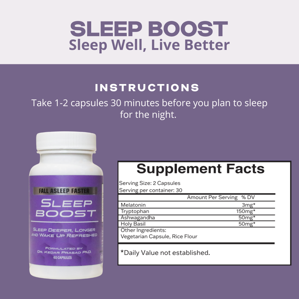 Don't let restless nights ruin your days. Make the switch to Sleep Boost now! Specially formulated by Dr. Kedar Prasad, Sleep Boost not only ensures a good night's sleep but also a more productive and stress-free tomorrow.