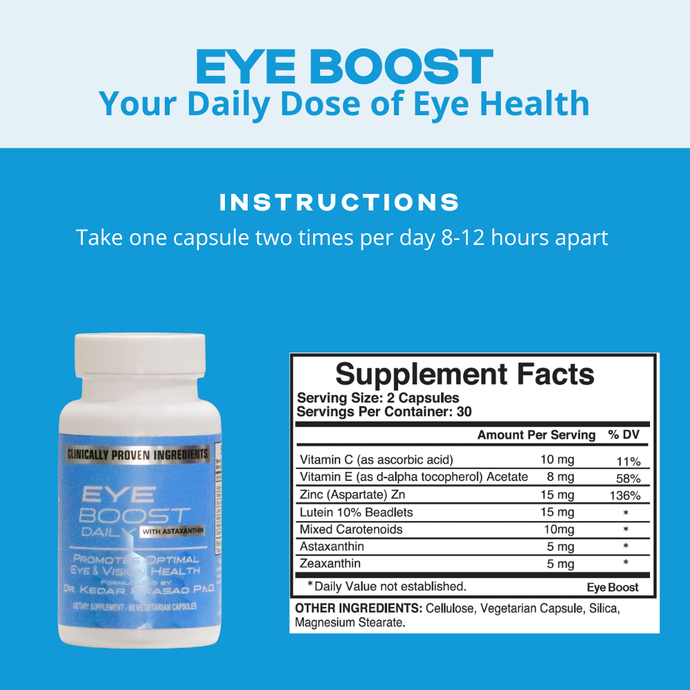 Unlock the potential for enhanced vision and eye health with Eye Boost, your comprehensive solution to the modern-day challenges your eyes face. Formulated by the renowned Dr. Prasad, Eye Boost is a testament to innovation in eye care, blending clinically proven ingredients with cutting-edge science to protect and optimize your eye health.