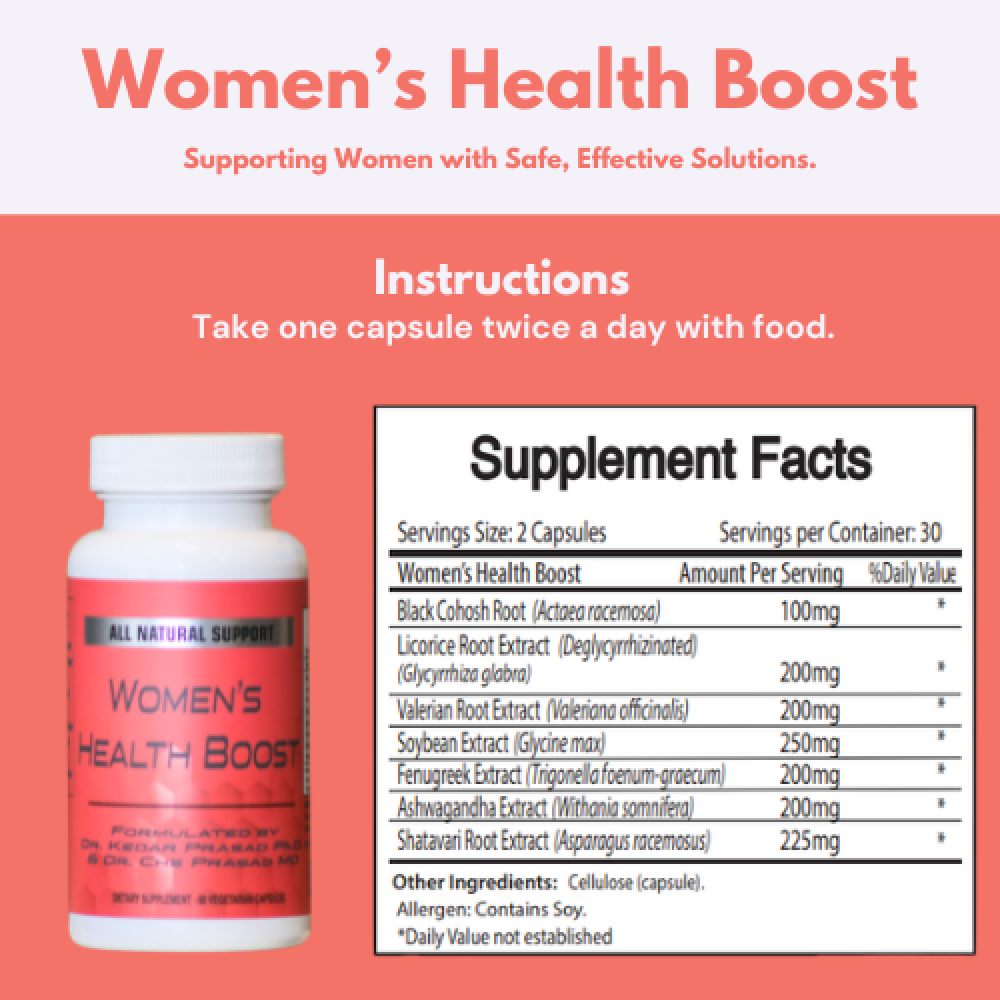 Women’s Health Boost, scientifically designed by Dr. Kedar Prasad, Ph.D., and Dr. Che Prasad, MD, is a comprehensive formula that helps promote hormonal balance, energy, mood, sleep, and overall well-being during every hormonal stage.